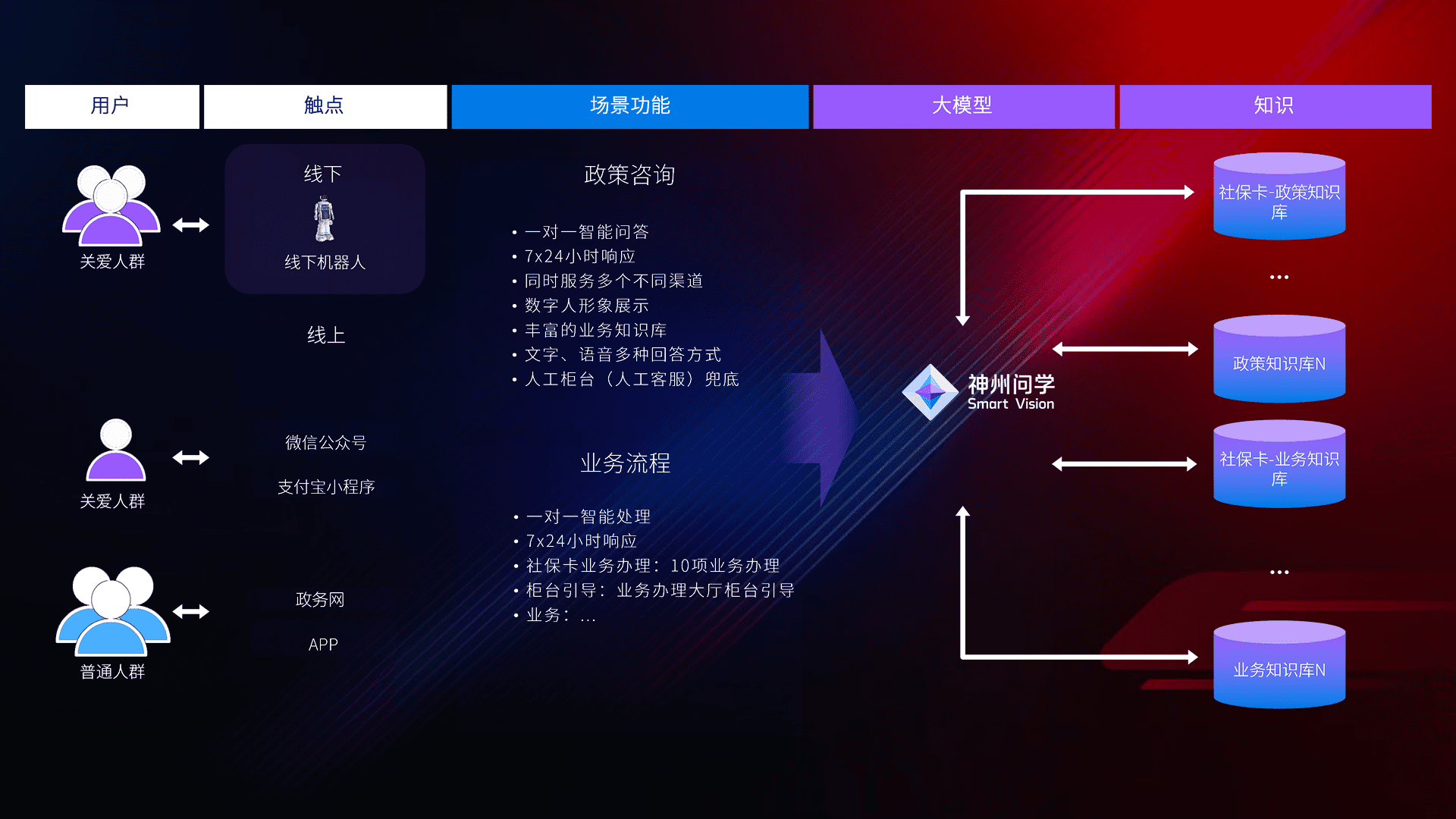 • 线上线下全覆盖:线上提供微信公众号、、、支付宝小程序、、、、政务网、、、、app多种渠道,,与线下机器人形成完整服务体系。。