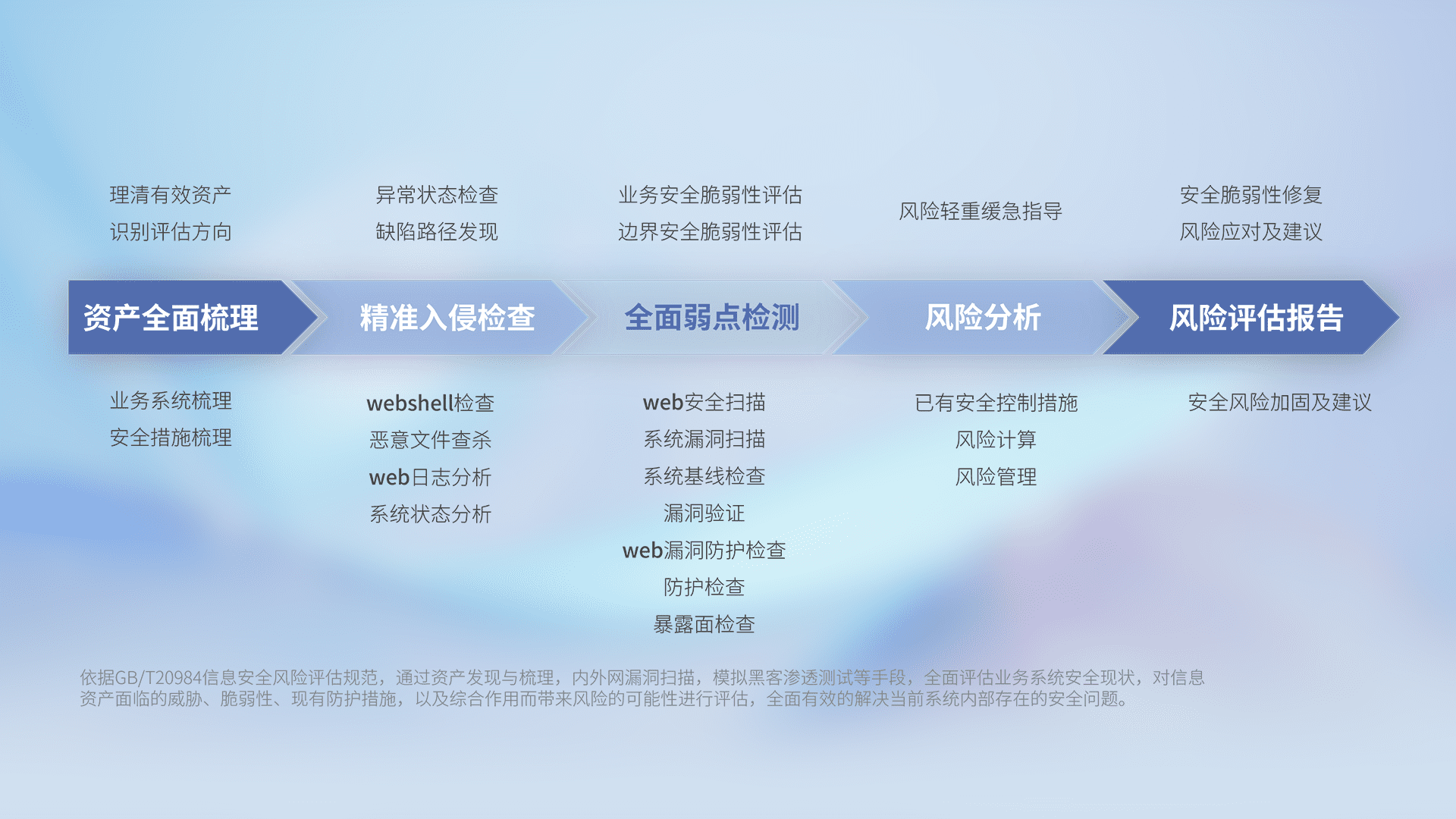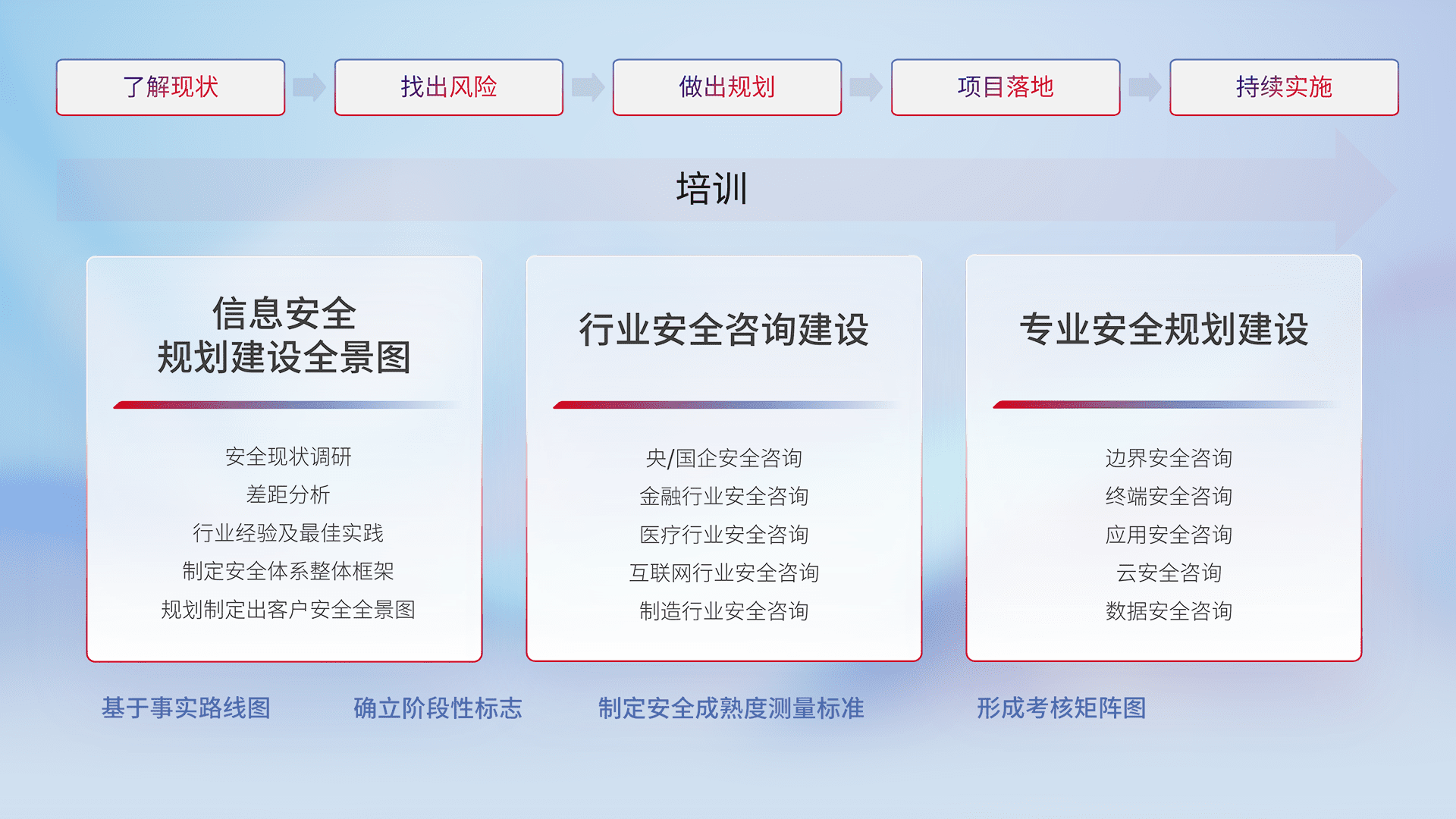 针对客户行业特性,,以专业的安全服务+多厂商联合解决方案提供专属的一站式安全管理服务,,帮助客户全面感知网络空间威胁,,,基于识别、、、检测、、分析、、、、防护、、、监测、、响应的服务理论模型,,,,从方案咨询、、、集成交付、、评估验证、、、优化加固、、、、运维运营,,,致力于为客户提供完整的闭环管理式安全服务。。。以实战经验为客户打造高抵御风险的安全体系,,,,帮助客户发现威胁、、、对抗威胁、、、处置威胁,,不断积累安全对抗能力,,持续保障数字化安全。。。